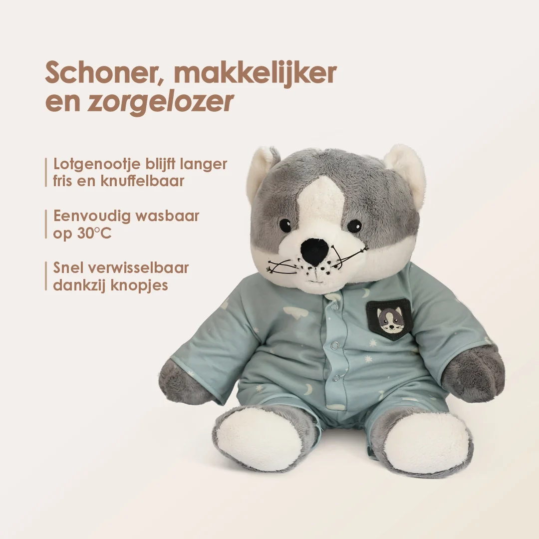Unsere Lotgenootjes werden intensiv genutzt. Im Bett, in der Schule, unterwegs oder in der Pflege. Da sie nicht in die Waschmaschine dürfen, ist Hygiene wichtig. Die Kleidung schützt Ihr Lotgenootje vor Schmutz, Flecken und Abnutzung – und ist leicht bei 30°C waschbar.
