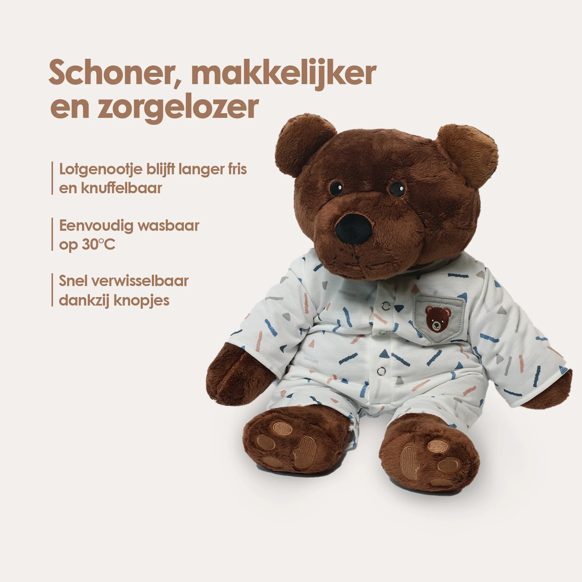 Unsere Lotgenootjes werden intensiv genutzt. Im Bett, in der Schule, unterwegs oder in der Pflege. Da sie nicht in die Waschmaschine dürfen, ist Hygiene wichtig. Die Kleidung schützt Ihr Lotgenootje vor Schmutz, Flecken und Abnutzung – und ist leicht bei 30°C waschbar.