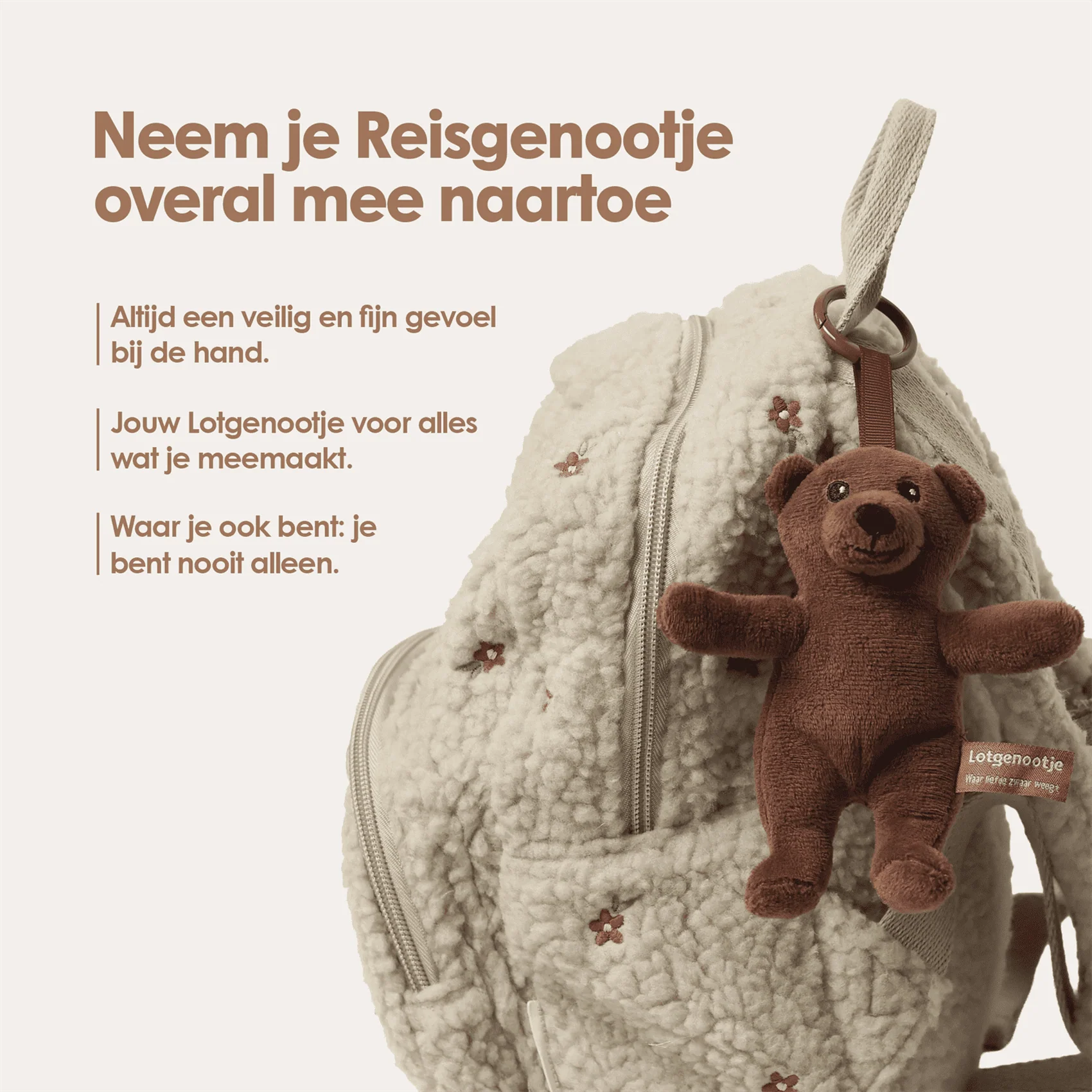 Das Leben ist eine große Reise mit schönen, aber auch stressigen oder aufregenden Momenten. Mit diesem Reisebegleiter an deiner Tasche hast du die vertraute Geborgenheit von Lotgenootje immer griffbereit. Es ist ein treuer Begleiter, der den ganzen Tag sichtbar mitreist und dich daran erinnert, dass du nie allein bist.